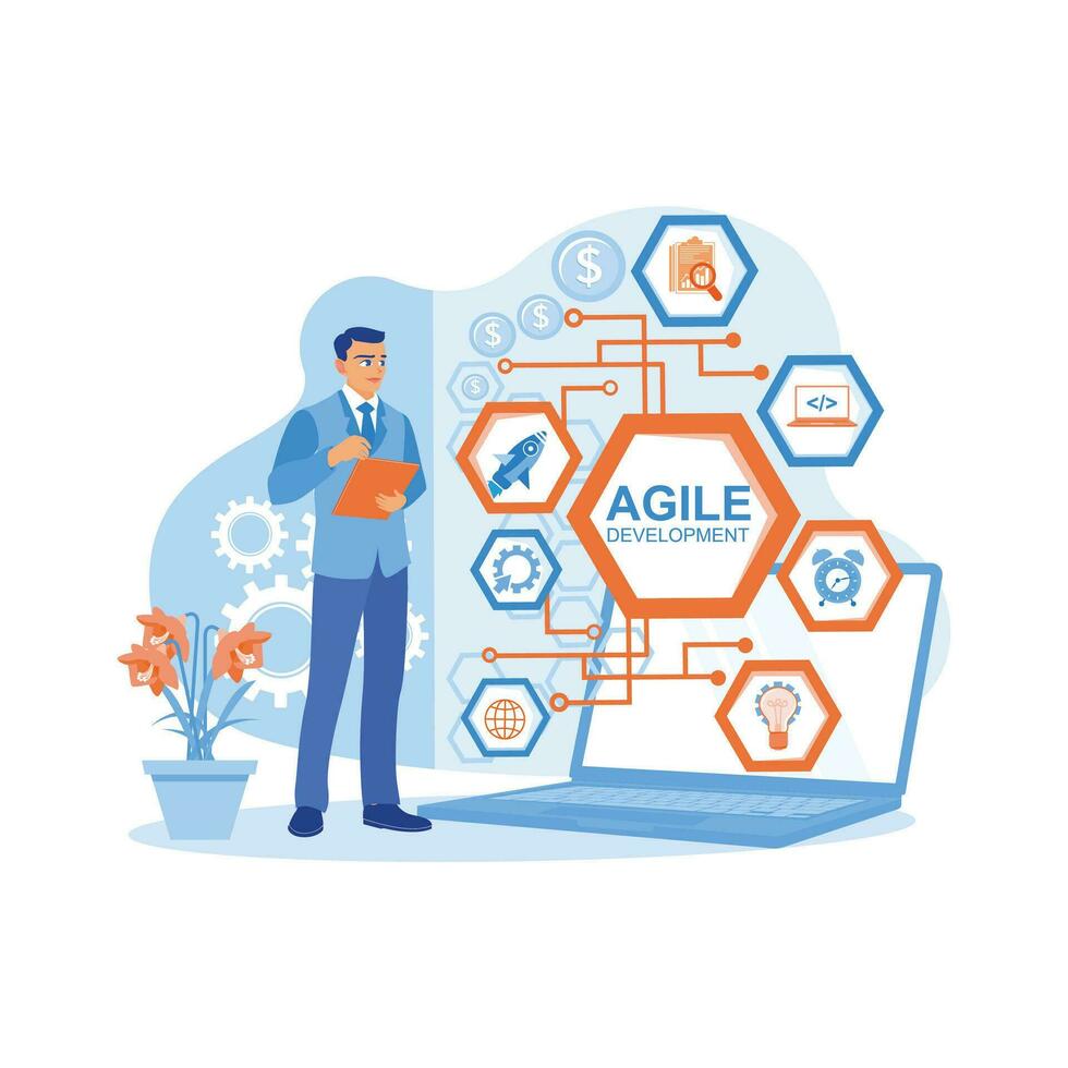 negocio personas utilizar digital tabletas y laptops a desarrollar ágil software. codificación computadora destreza web negocio ágil rápido comienzo arriba concepto. software desarrolladores concepto. Vector Pro
