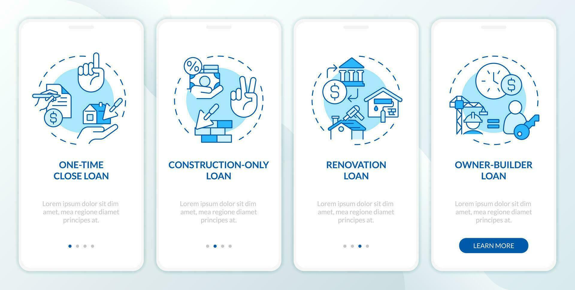 2d íconos representando construcción costo móvil aplicación pantalla colocar. recorrido 4 4 pasos azul gráfico instrucciones con línea íconos concepto, ui, ux, gui modelo. Pro Vector y Pro SVG