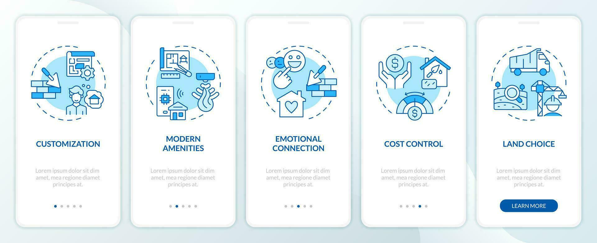 2d íconos representando construcción costo móvil aplicación pantalla colocar. recorrido 5 5 pasos azul gráfico instrucciones con Delgado línea íconos concepto, ui, ux, gui modelo. Vector Pro