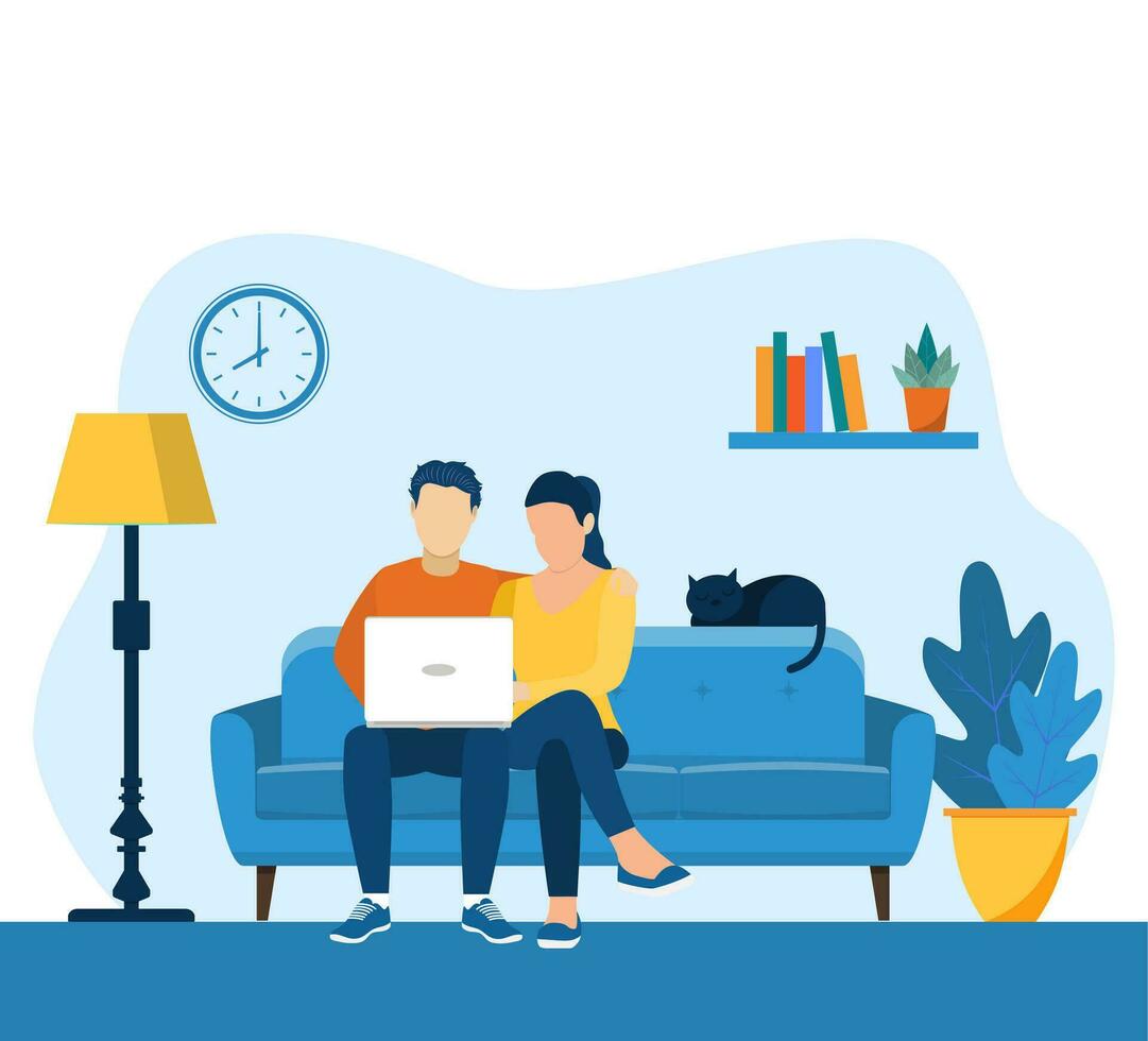 joven Pareja utilizando un ordenador portátil mientras sentado en un sofá. web página diseño modelo para en línea educación, aprendiendo, vídeo tutoriales vector ilustración en plano estilo Vector Pro