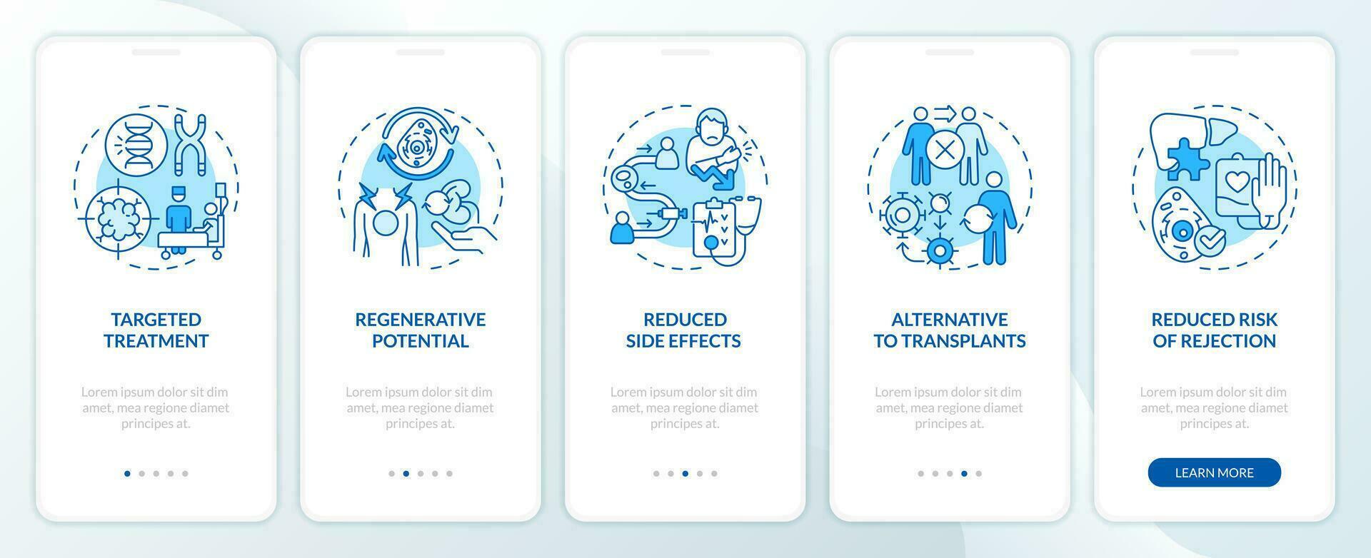 2d íconos representando célula terapia beneficios móvil aplicación pantalla colocar. recorrido 5 5 pasos azul gráfico instrucciones con línea íconos concepto, ui, ux, gui modelo. Vector Pro