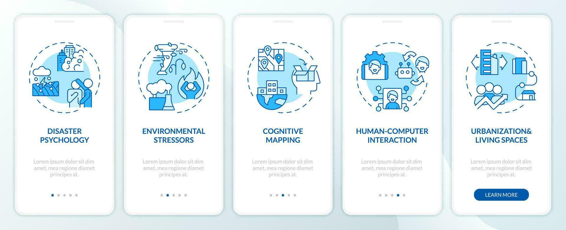 2d íconos representando ambiental psicología areas de estudiar móvil aplicación pantalla colocar. recorrido 5 5 pasos azul gráfico instrucciones con Delgado línea íconos concepto, ui, ux, gui modelo. Vector Pro