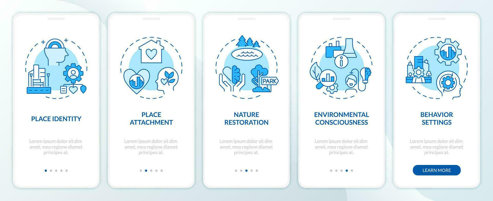 2d íconos representando ambiental psicología conceptos móvil aplicación pantalla colocar. recorrido 5 5 pasos azul gráfico instrucciones con línea íconos concepto, ui, ux, gui modelo. Vector Pro