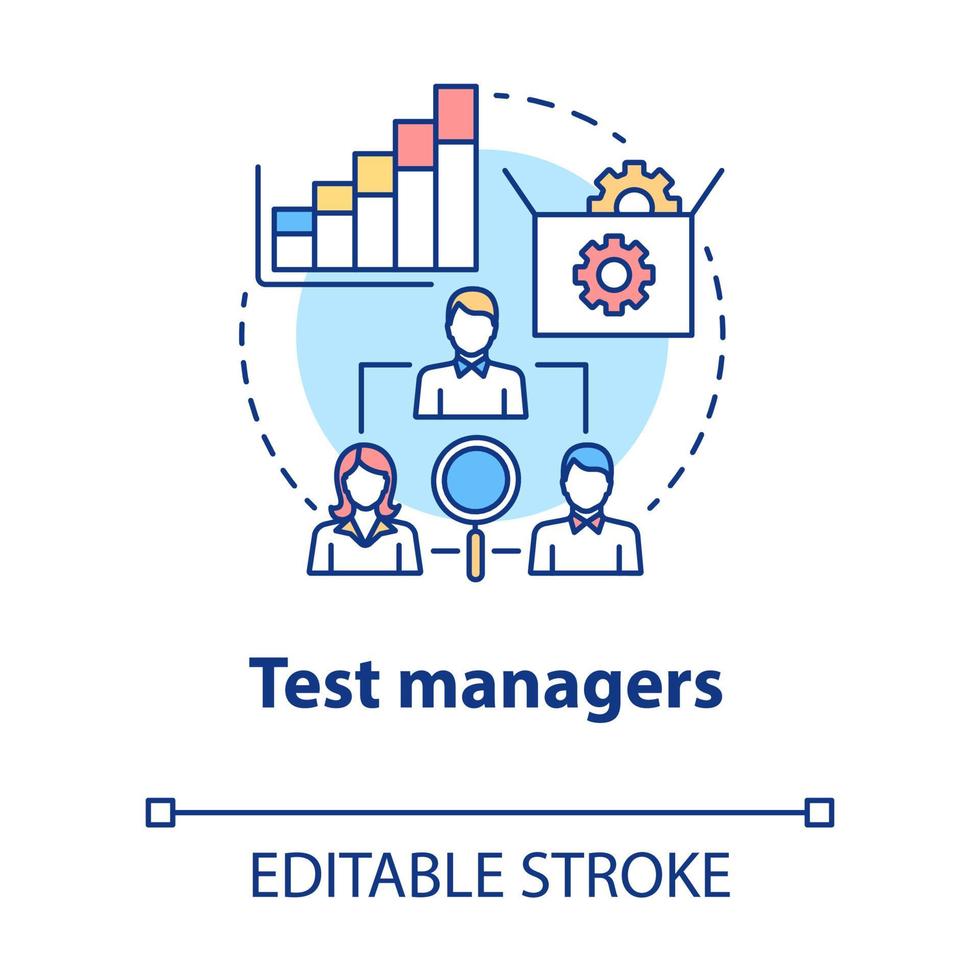 icono de concepto de administradores de prueba. Ilustración de línea fina de idea de desarrollo de software. programación de aplicaciones. comprobación de la funcionalidad del sistema. it gestión de proyectos. dibujo de contorno aislado vectorial. trazo editable Vector Pro