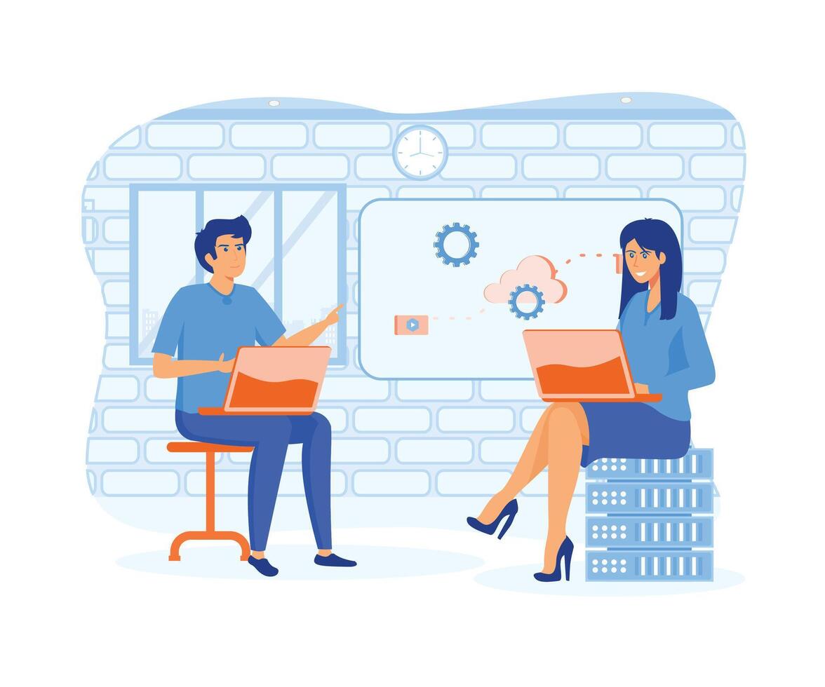 nube informática concepto. hombre y mujer Procesando información a laptops utilizando nube tecnología, datos almacenamiento y respaldo. plano vector moderno ilustración Vector Pro