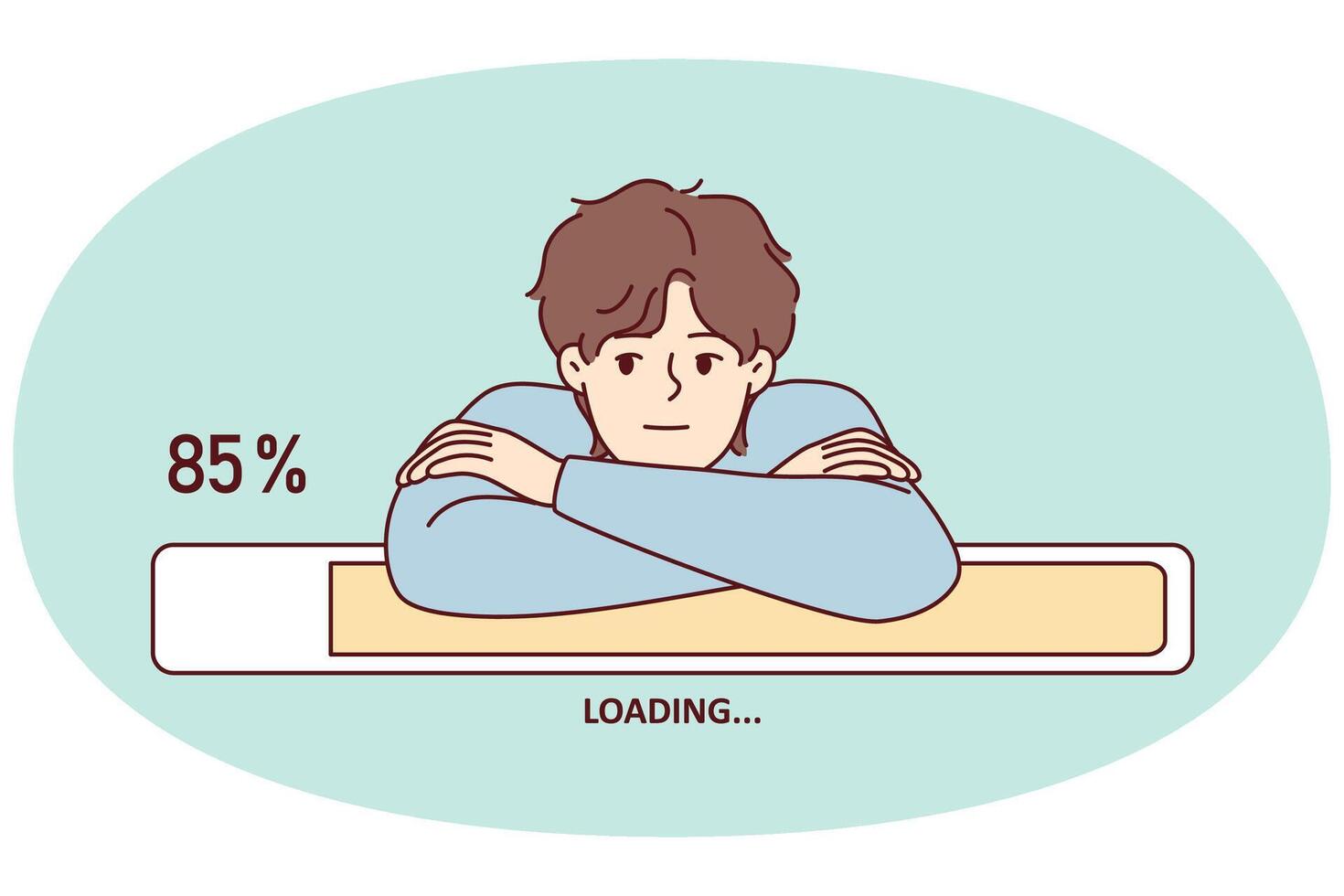 aburrido hombre propensión en Progreso línea cargando esperando a descargar película desde Internet. vector imagen Vector Pro