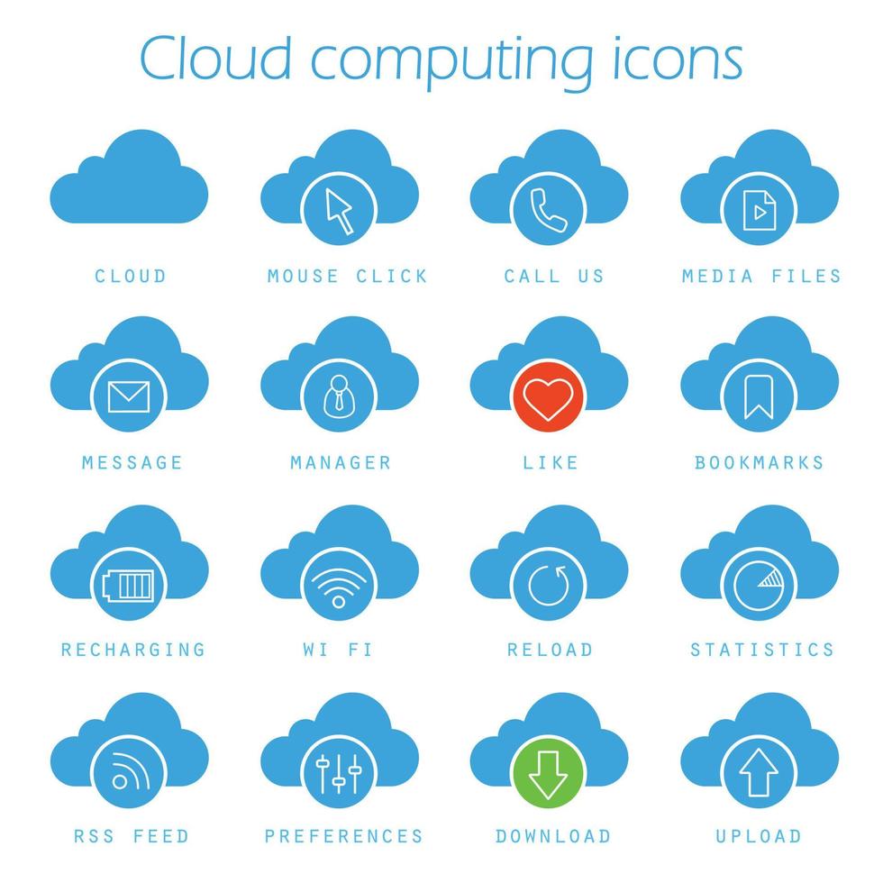 conjunto de iconos de computación en la nube. símbolos de silueta de almacenamiento web. clic del mouse, marcadores, estadísticas, recarga, wifi, descarga y carga de símbolos de alojamiento web. vector ilustración aislada Vector Pro