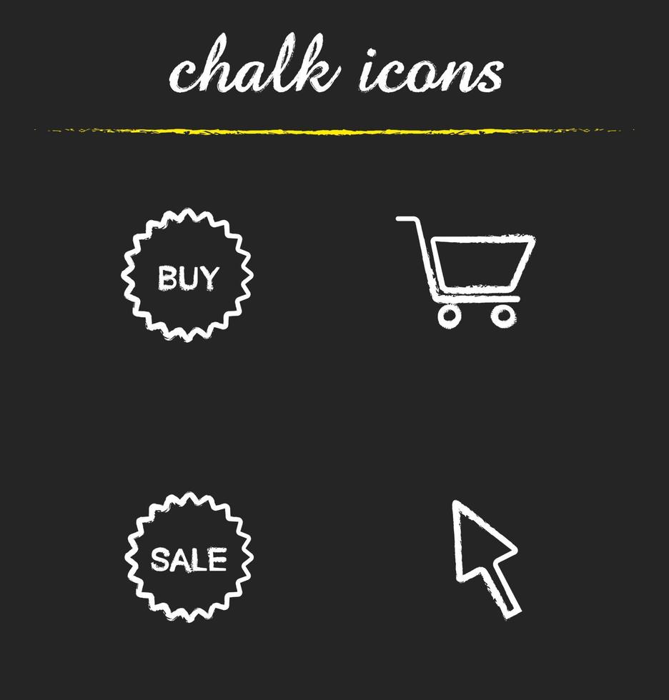Conjunto de iconos de tiza de compras en línea. comprar y vender pegatinas, botón añadir al carrito, cursor del ratón de la computadora. ilustraciones de pizarra vector aislado Vector Pro