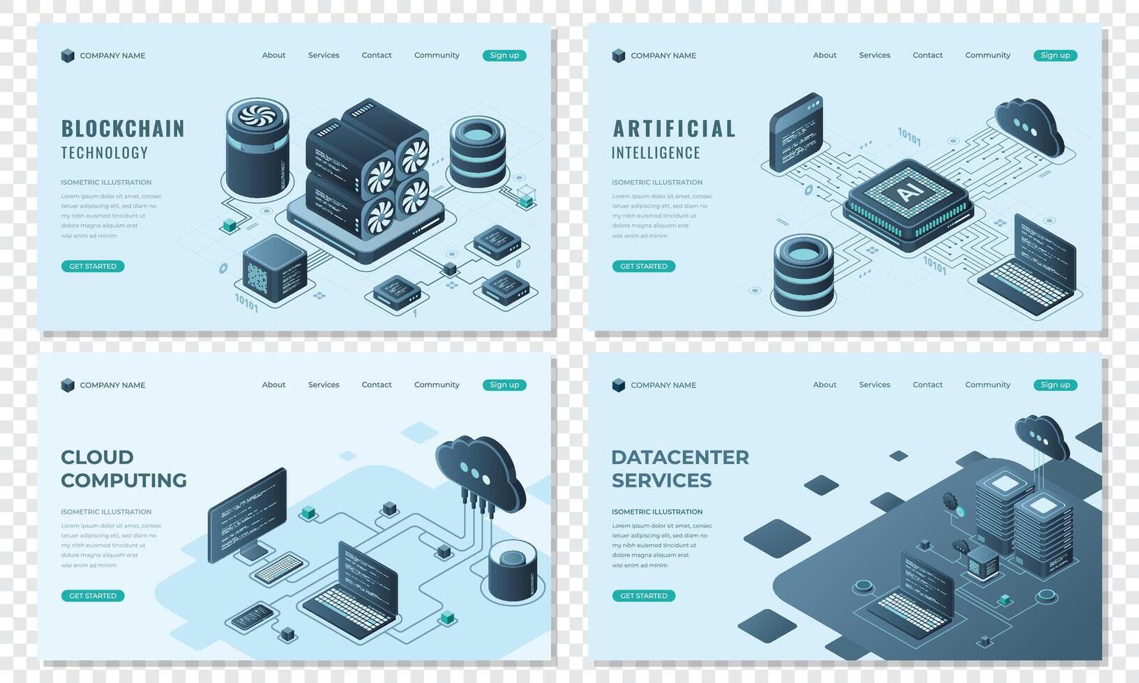 conjunto de isométrica aterrizaje página modelo. moderno tecnología concepto para centro de datos con servidor, artificial inteligencia, y blockchain tecnología Vector Pro