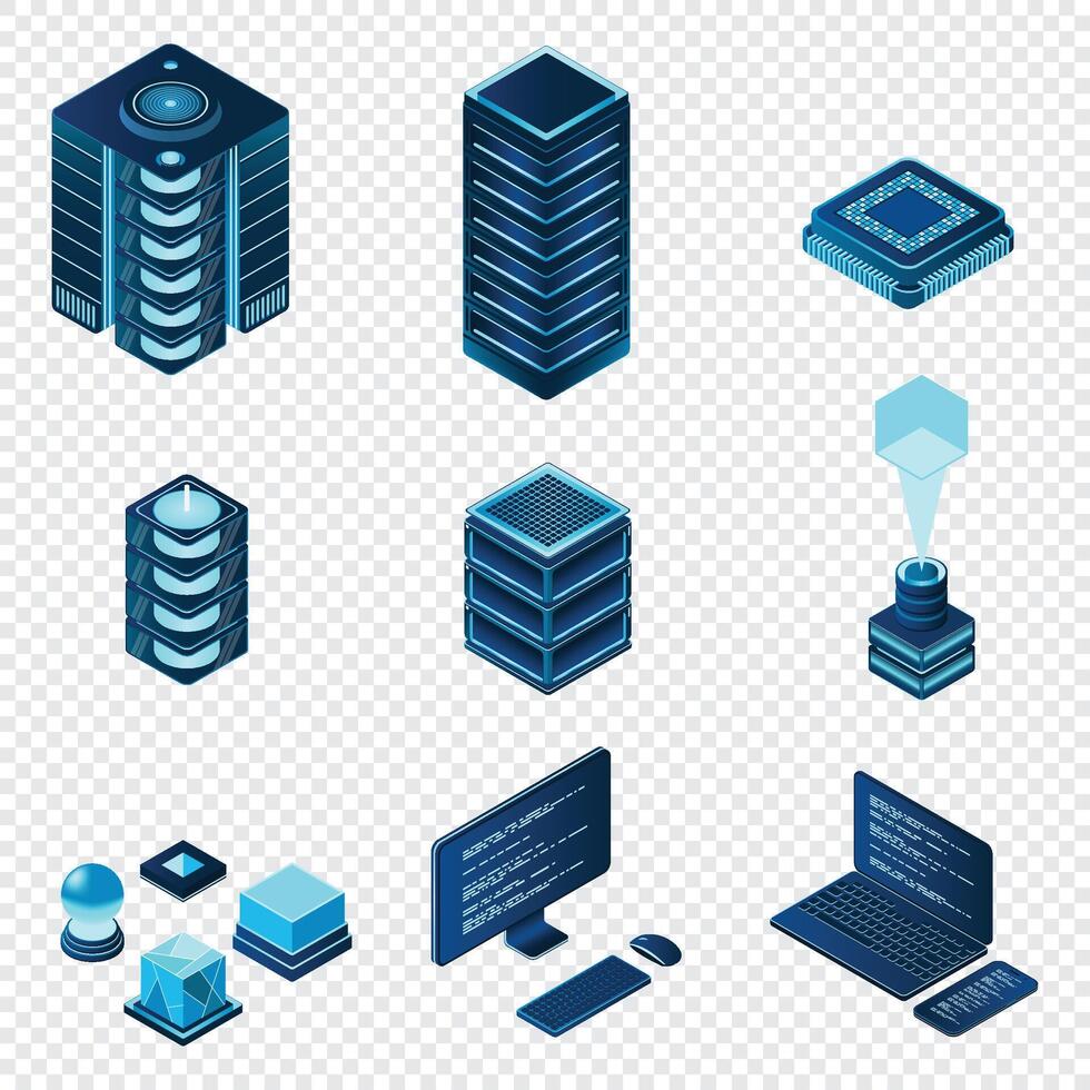 conjunto de isométrica computadora tecnología. isométrica conjunto servidor equipo. tecnología isométrica iconos digital tecnología elementos. ilustración Vector Pro