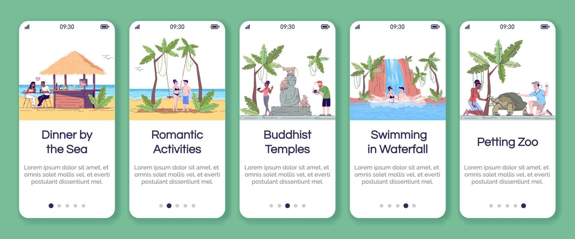 Plantilla de vector de pantalla de aplicación móvil de incorporación de turismo de Indonesia. país tropical. Turismo. paso a paso del sitio web con caracteres planos. concepto de interfaz de dibujos animados de smartphone ux, ui, gui Vector Pro