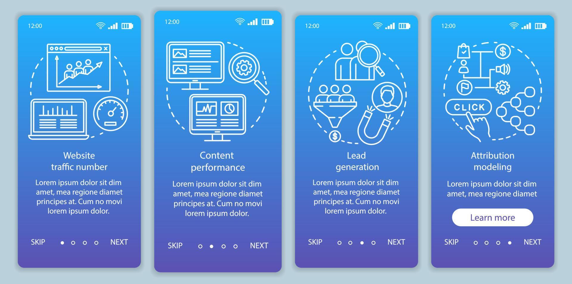 Beneficios del marketing digital Plantilla de vector de pantalla de página de aplicación móvil incorporada degradado azul. paso a paso del sitio web con ilustraciones lineales. concepto de interfaz de teléfono inteligente ux, ui, gui Pro Vector y Pro SVG