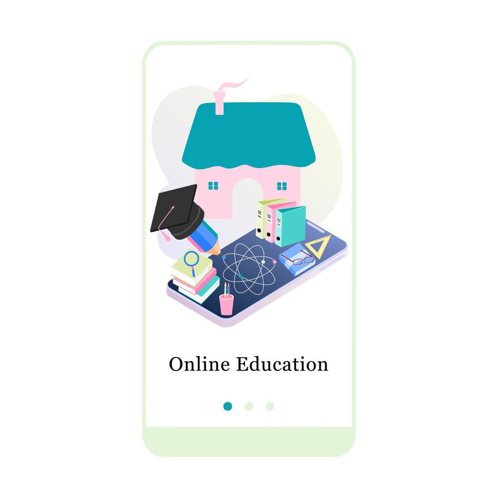 educación en línea, e-learning, pantalla de incorporación de la aplicación móvil de la escuela en línea. plantilla de banner de vector de menú para interfaz ux, desarrollo móvil de pantalla ui gui. diseño de sitios web ilustración plana isométrica 3d. Vector Gratis