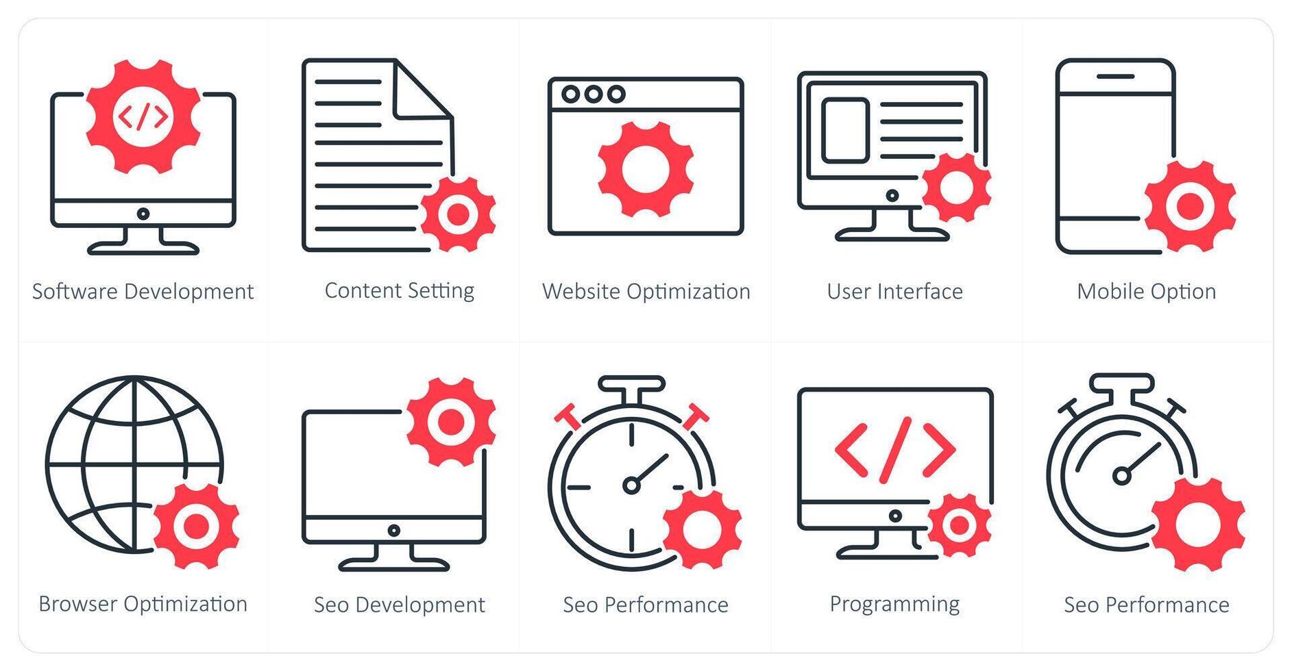 un conjunto de 10 seo íconos como software desarrollo, contenido configuración, sitio web mejoramiento Vector Pro