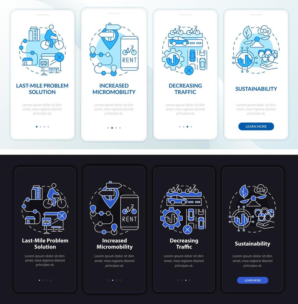 profesionales de scooter-share incorporando la pantalla de la página de la aplicación móvil. Disminuir el tráfico tutorial Instrucciones gráficas de 4 pasos con conceptos. ui, ux, plantilla de vector de interfaz gráfica de usuario con ilustraciones lineales en modo día y noche Vector Pro