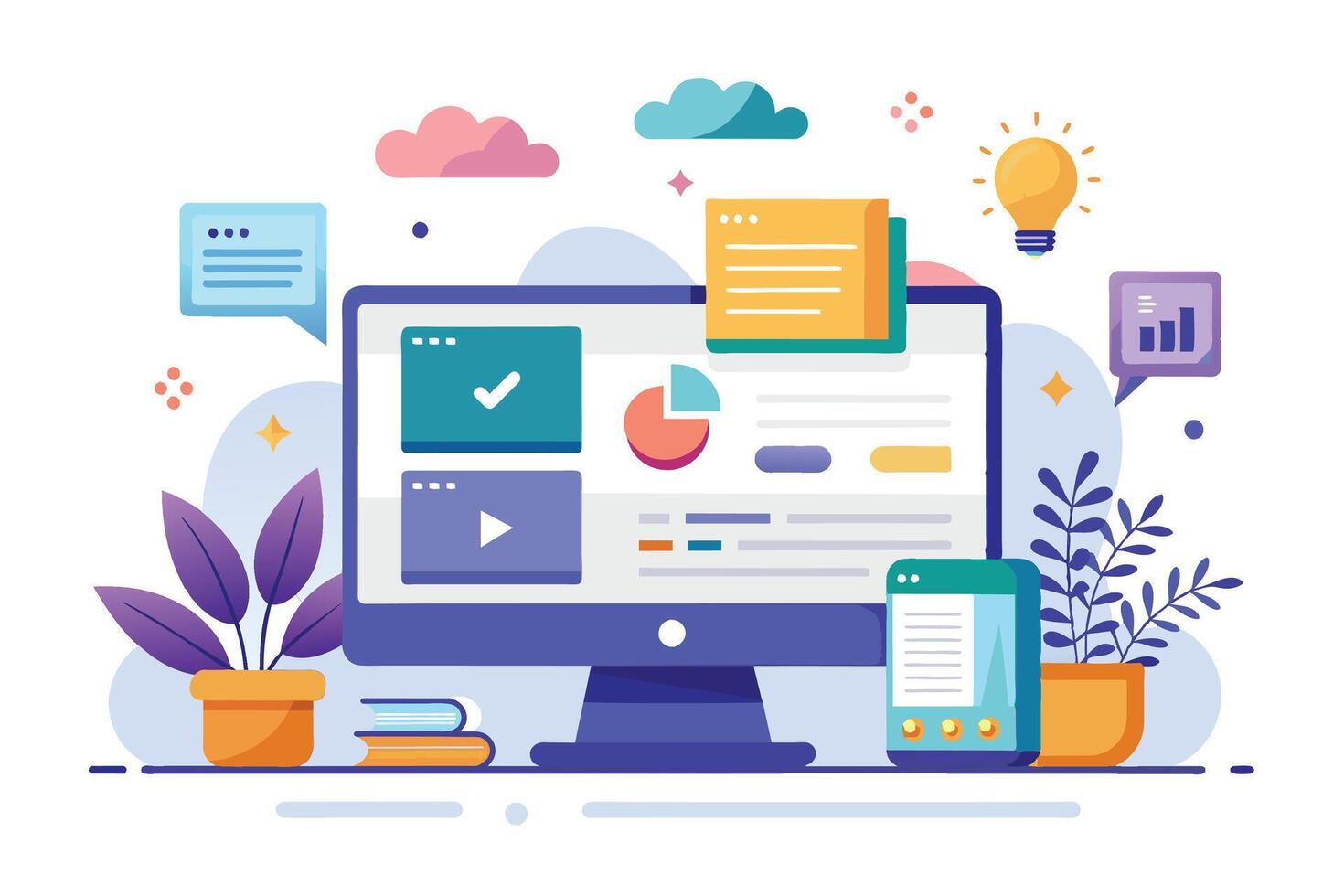 un ilustración de un escritorio computadora y un teléfono inteligente mostrando datos, gráficos, y ideas el computadora pantalla caracteristicas un Lista de Verificación, un jugar botón, y un tarta cuadro. vector
