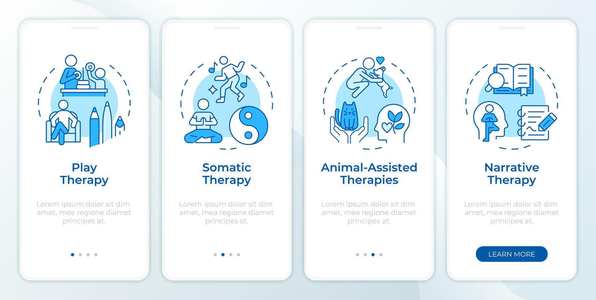 mental asesoramiento enfoques azul inducción móvil aplicación pantalla. recorrido 4 4 pasos editable gráfico instrucciones con lineal conceptos. ui, ux, gui modelo Vector Pro