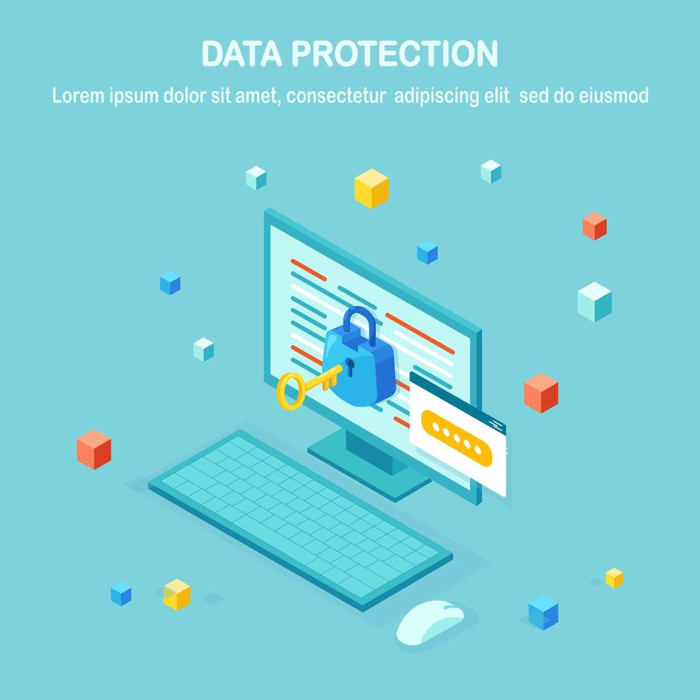 protección de Datos. seguridad en internet, acceso a la privacidad con contraseña. Pc de computadora isométrica 3d con llave, cerradura. diseño vectorial para banner Vector Pro