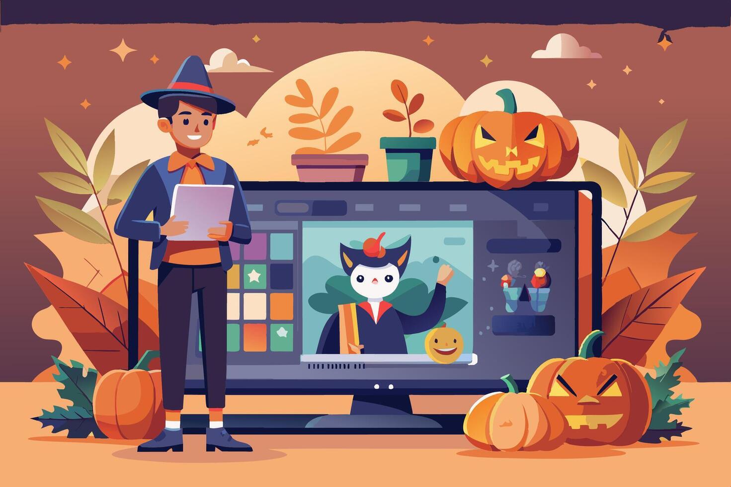 un hombre en un bruja disfraz en frente de un computadora piedra con un gato Vector Pro