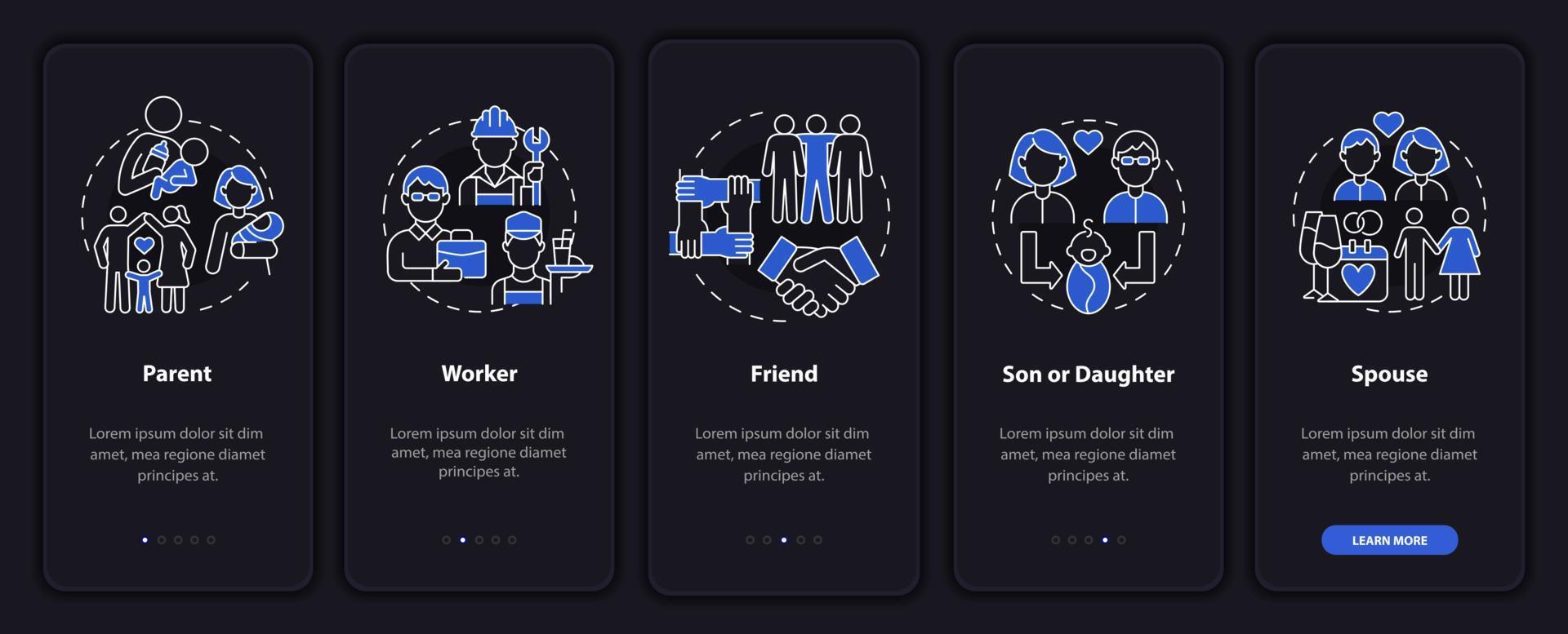 ejemplo de rol social incorporando la pantalla de la página de la aplicación móvil. papel en la comunidad tutorial 5 pasos instrucciones gráficas con conceptos. ui, ux, plantilla de vector de interfaz gráfica de usuario con ilustraciones lineales en modo nocturno Vector Pro