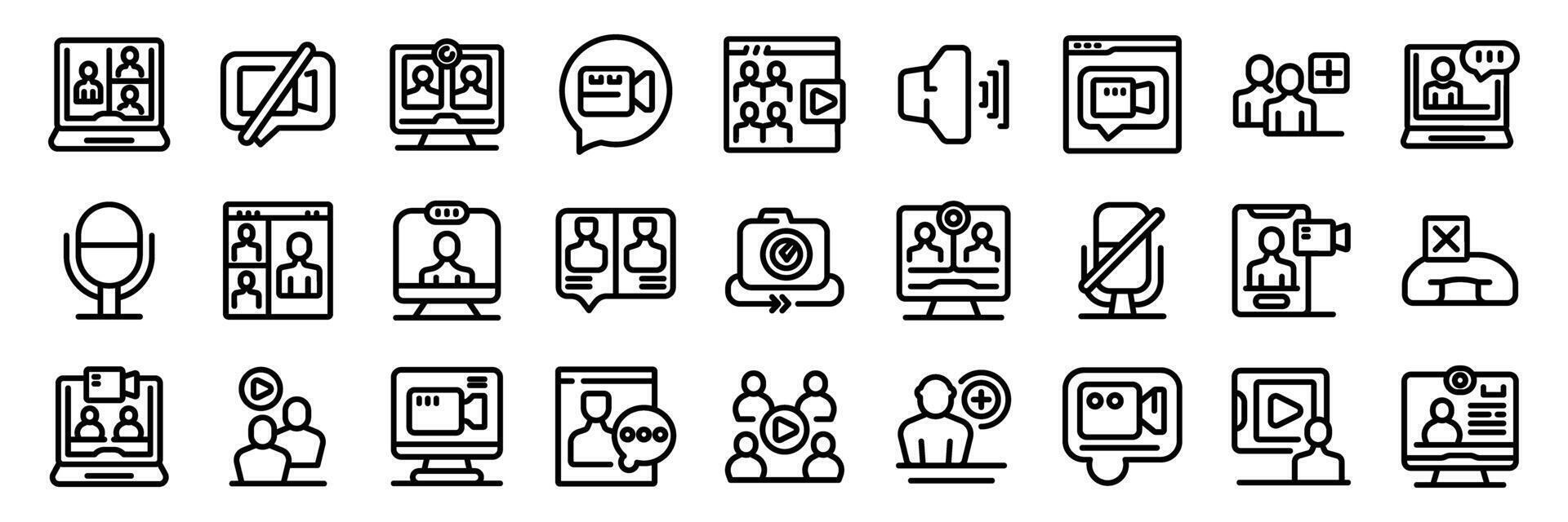 videollamada íconos colocar. personas utilizando vídeo llamada aplicación para en línea reunión y conferencia en computadora pantalla icono conjunto Vector Pro