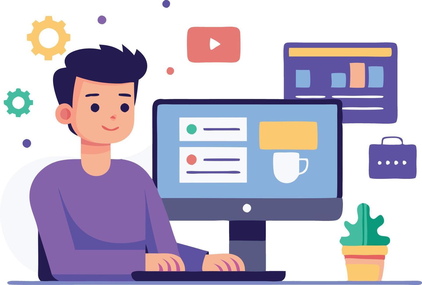 un joven hombre trabajando en un computadora a hogar mientras atractivo en digital contenido creación y en línea comunicación vector