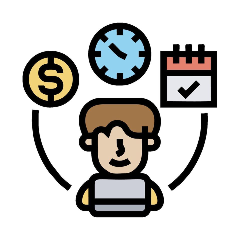 un hombre es sentado en frente de un computadora con un reloj, dinero y un calendario vector