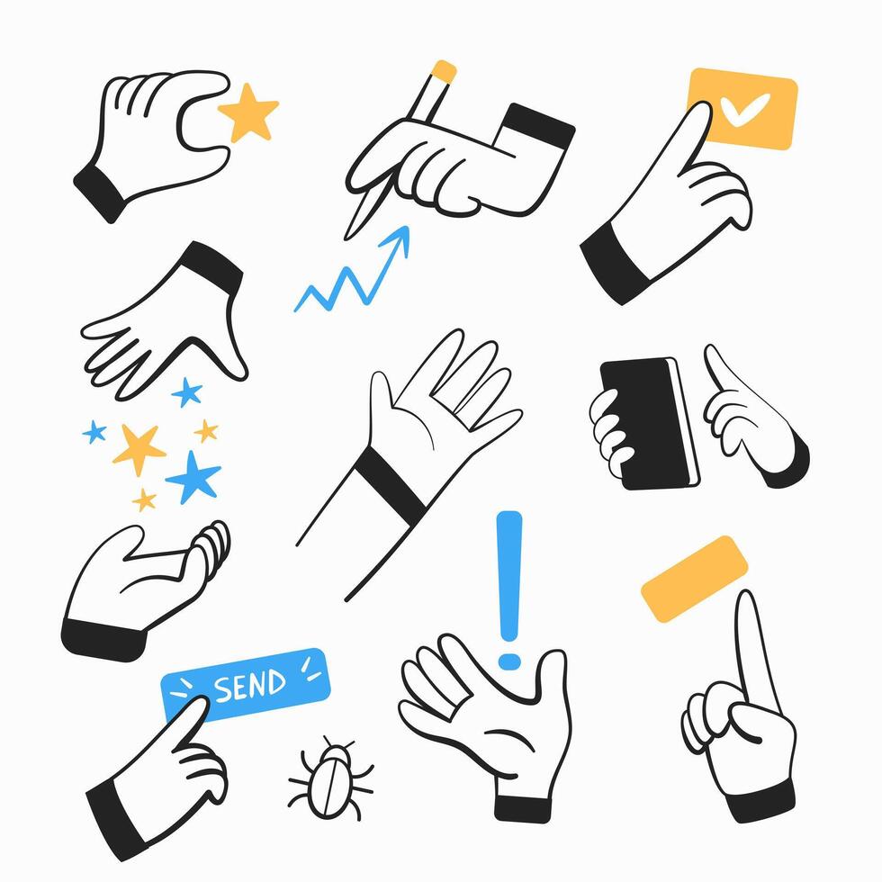 un conjunto de íconos con manos acerca de ajuste un tarea, hallazgo un solución, lograr éxito, etc. Vector Pro
