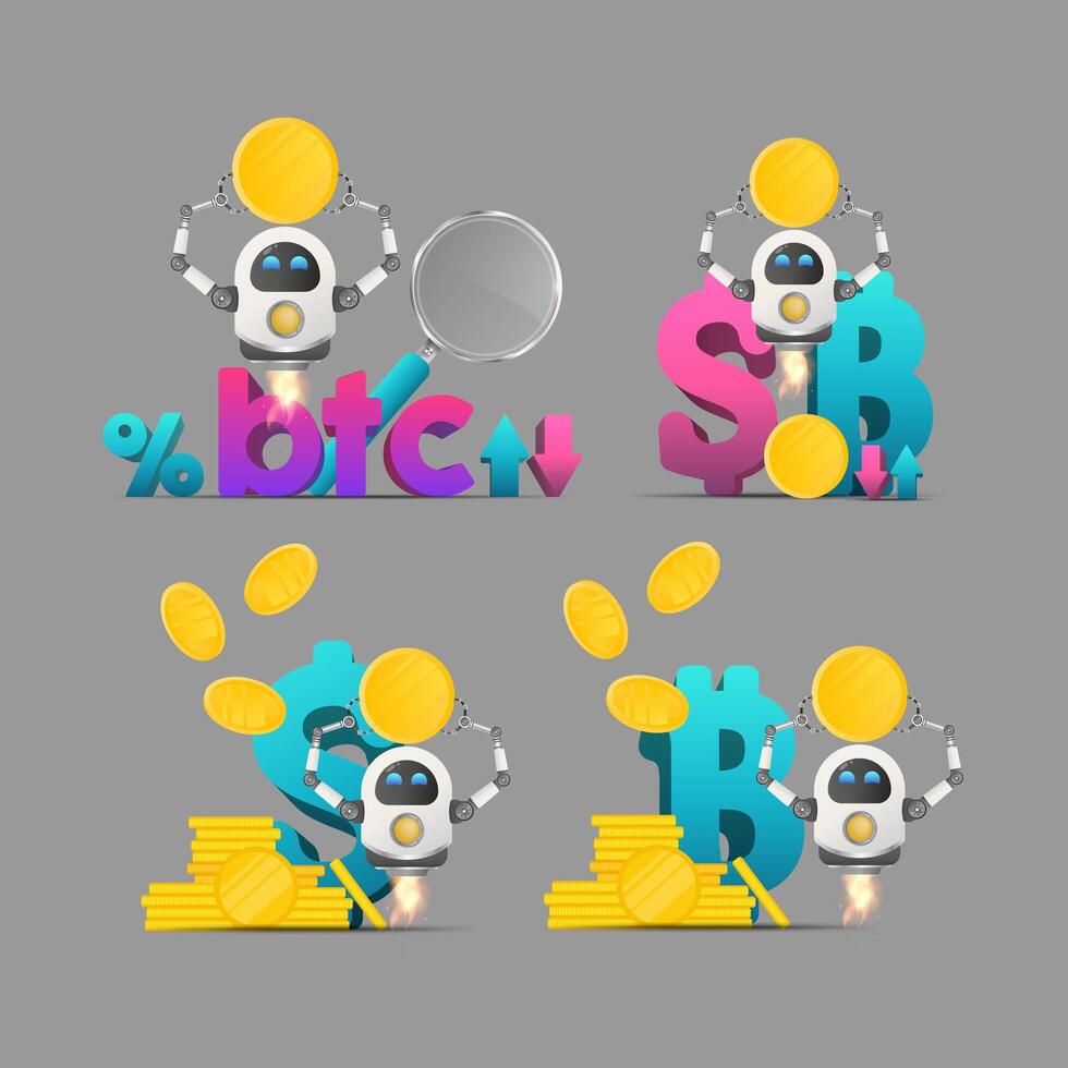 un conjunto de conceptos sobre el tema de invertir en dólares o bitcoins. robots voladores bots. vector. Vector Pro