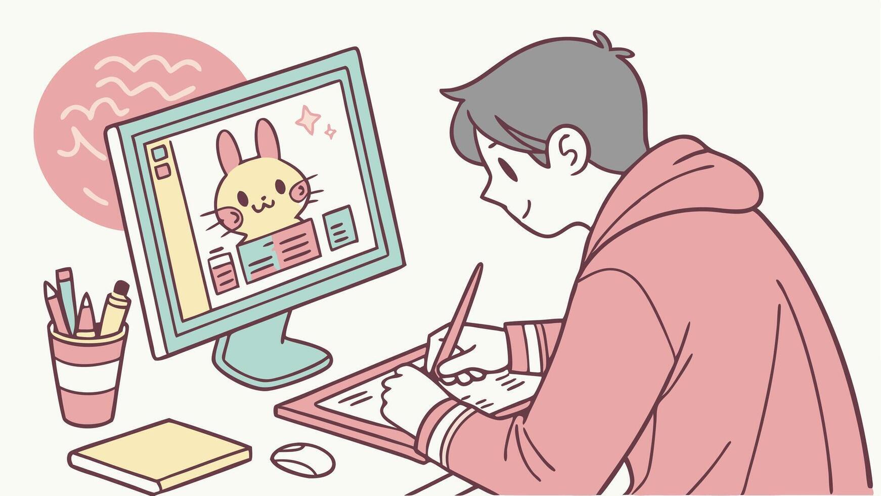 un hombre es trabajando en un computadora con un conejito en el pantalla Vector Gratis