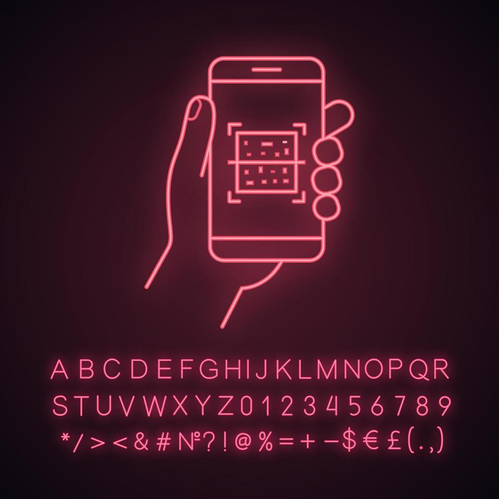 icono de luz de neón del escáner del teléfono inteligente con código qr. Código de Respuesta Rápida. aplicación de teléfono móvil de escaneo de código de barras de matriz. signo brillante con alfabeto, números y símbolos. ilustración vectorial aislada Vector Pro
