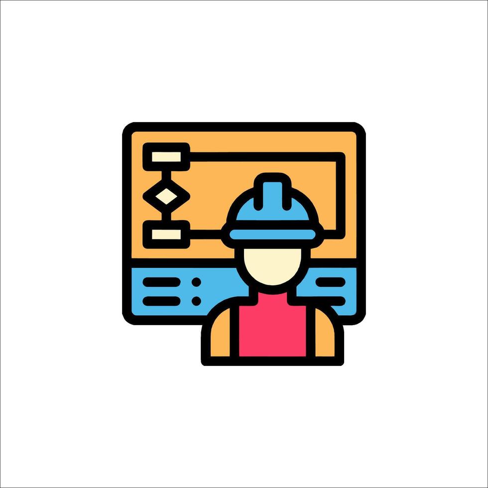 un hombre en un difícil sombrero es en pie en frente de un computadora vector