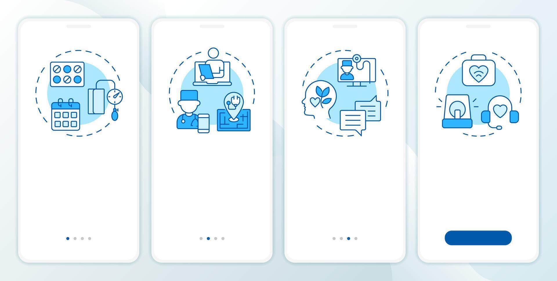 aplicaciones de telesalud azul inducción móvil aplicación pantalla. recorrido 4 4 pasos editable gráfico instrucciones con lineal conceptos. ui, ux, gui modelo Vector Pro