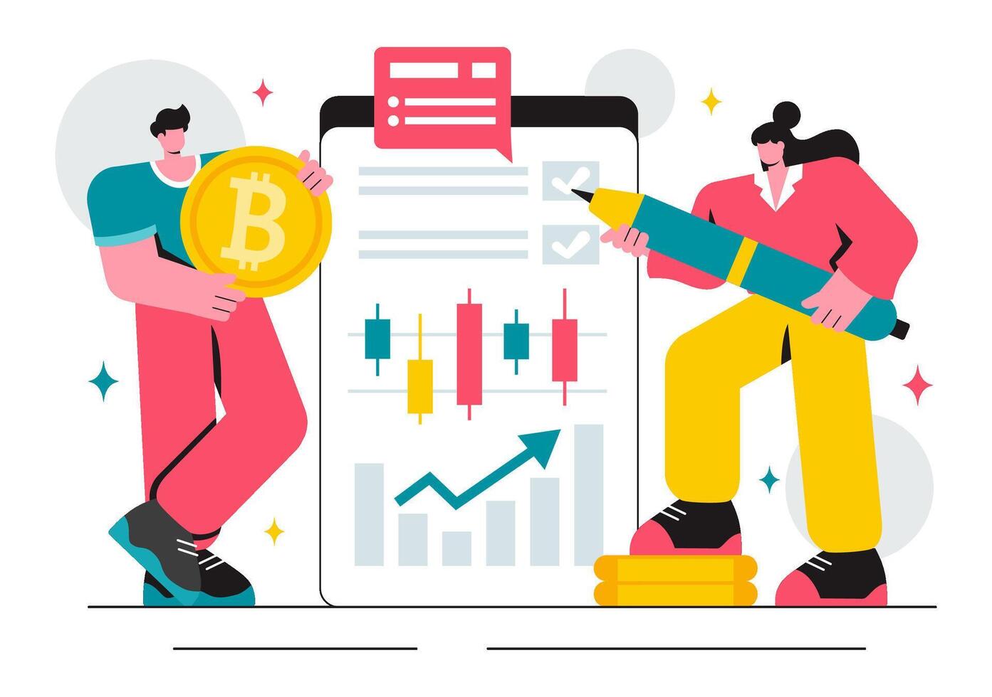 digital moneda comercio ilustración con bitcoin, blockchain billetera, y criptomoneda monedas en un plano dibujos animados antecedentes Vector Pro