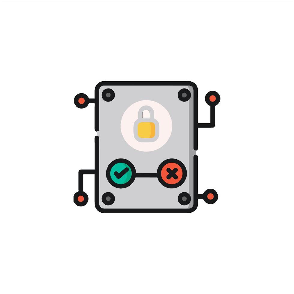 un plano icono de un computadora con un bloquear y cheque marca vector