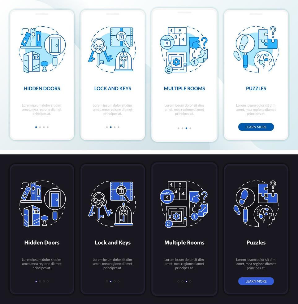 Aspectos de la sala de escape Pantalla de la aplicación móvil incorporada en el modo día y noche. tutorial 4 pasos páginas de instrucciones gráficas con conceptos lineales. interfaz de usuario, ux, plantilla de interfaz gráfica de usuario. innumerables fuentes pro-negrita y regulares utilizadas Vector Pro