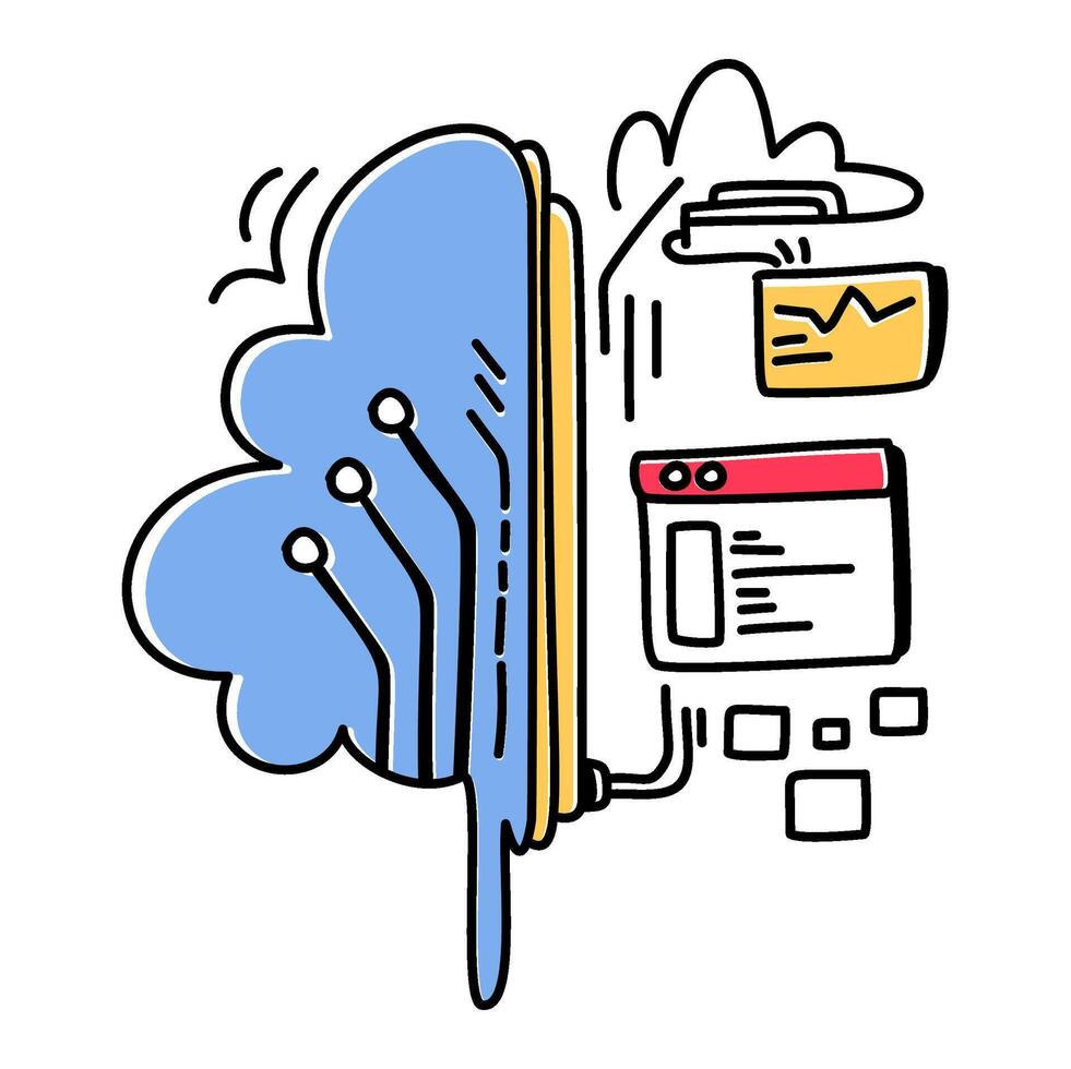 ilustración de un cerebro conectado a un nube, con datos corrientes y Procesando. ideal para basado en la nube ai, máquina aprendizaje Vector Pro