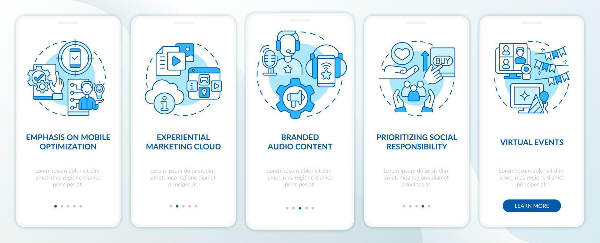 ejemplos de tendencias de marketing pantalla de aplicación móvil de incorporación azul. tutorial de innovación 5 pasos páginas de instrucciones gráficas con conceptos lineales. interfaz de usuario, ux, plantilla de interfaz gráfica de usuario. innumerables fuentes pro-negrita y regulares utilizadas Vector Pro