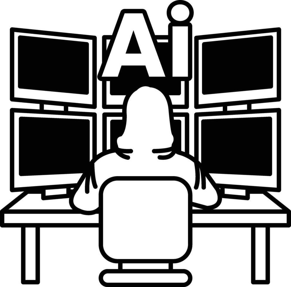 un hombre en un capucha se sienta en frente de un computadora con un monitor mostrando en negro y blanco línea estilo Vector Pro