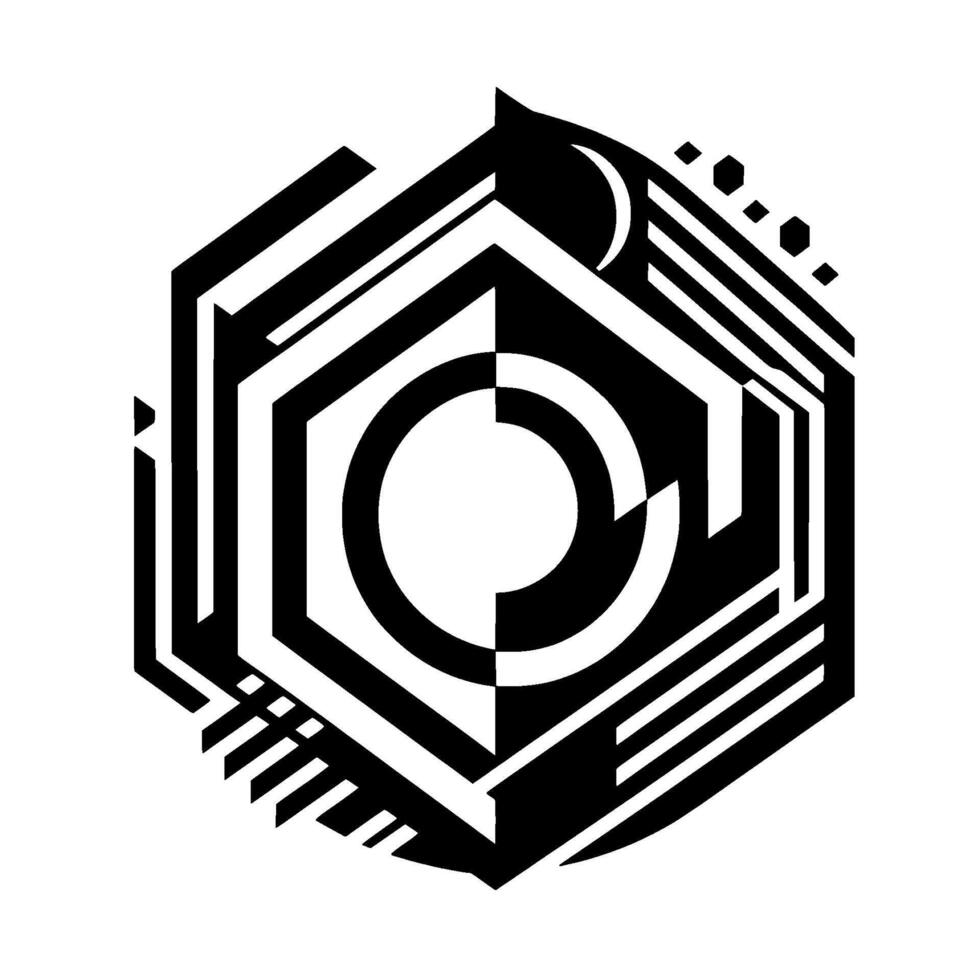 resumen geométrico emblema presentando un contrastando media Luna elemento, un central circulo bisecado y otro geométrico formas en monocromo, creando un moderno, equilibrado composición. vector