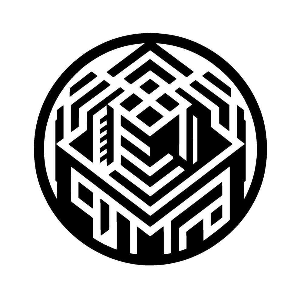 negro y blanco geométrico dentro un círculo, presentando un re cubo óptico espejismo con intrincado interconectado líneas y caminos vector