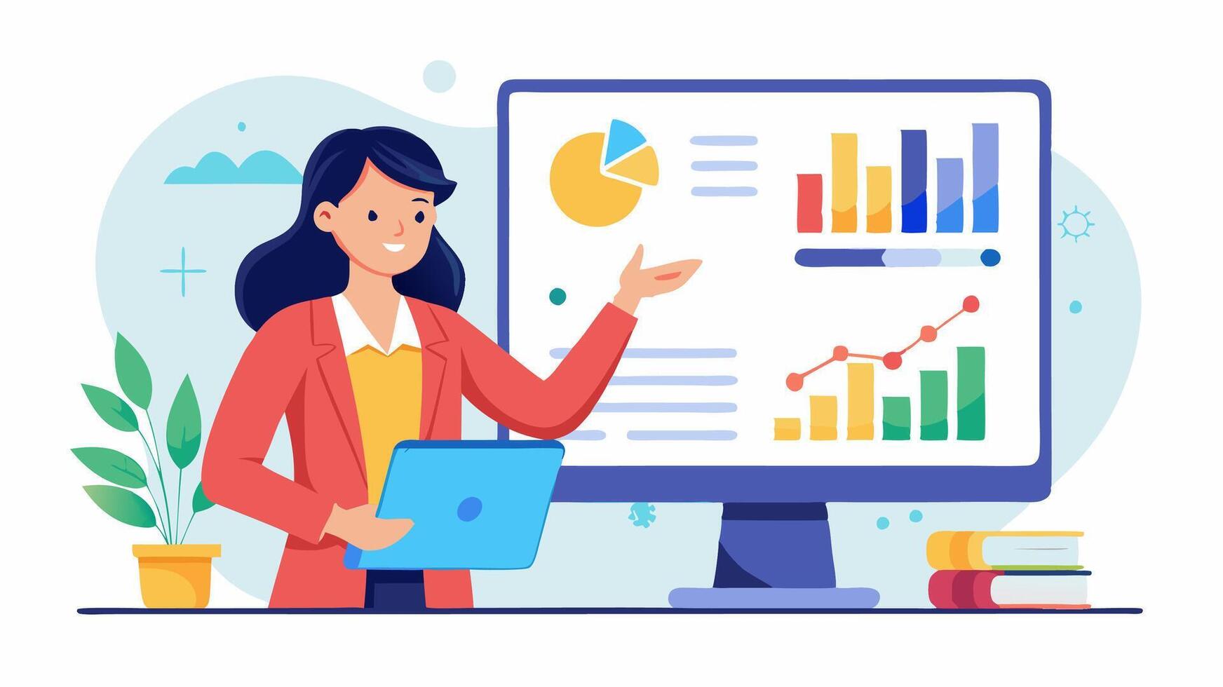 un mujer es en pie en frente de un computadora con un gráfico en eso Vector Pro