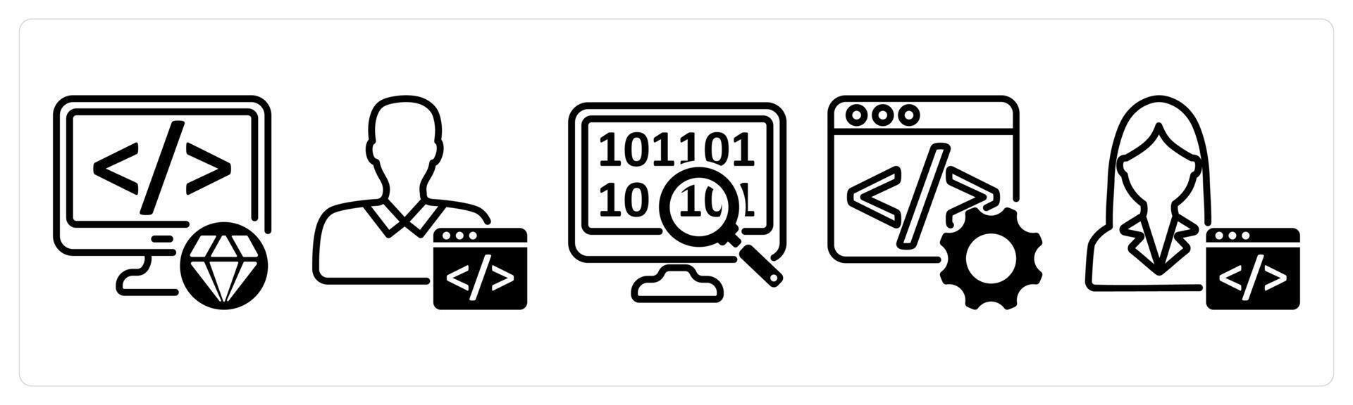 un conjunto de cinco negocio íconos como limpiar código, programador, datos buscar Vector Pro