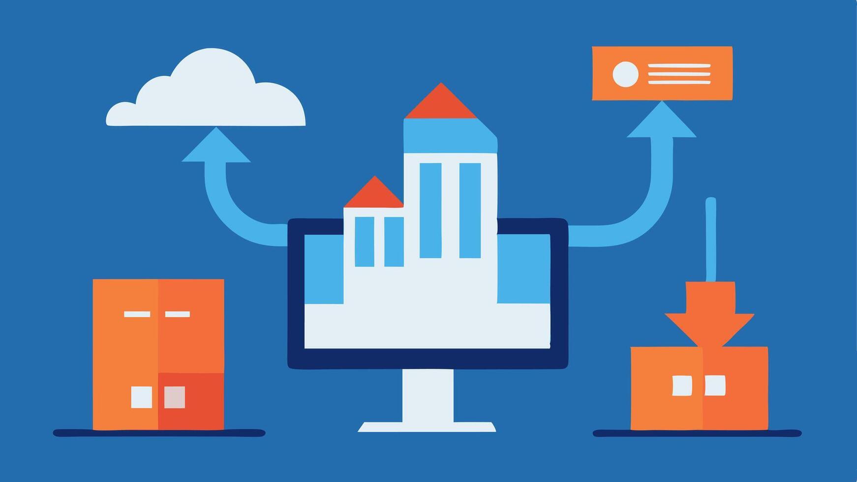 datos fluir flechas un ilustración con un 3d modelo de un edificio debajo construcción con flechas fluido Entre el real sitio y un computadora pantalla mostrando el digital mellizo. Vector Pro