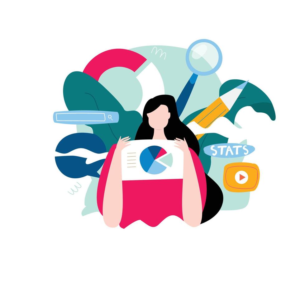 análisis de datos grandes, análisis de seo, estadísticas de gráficos de negocios, revisión de datos de negocios, informe de investigación financiera, diseño de ilustraciones vectoriales planas de infografías financieras para gráficos web y móviles Vector Pro