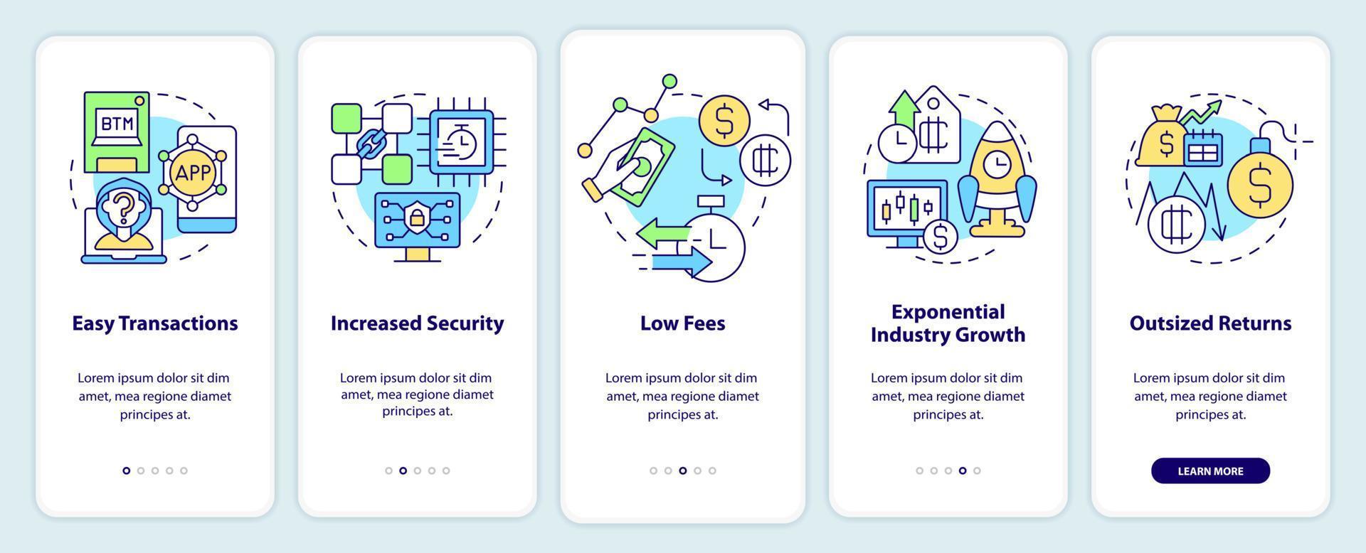 profesionales de criptomonedas que incorporan la pantalla de la aplicación móvil. tutorial de transacciones fáciles páginas de instrucciones gráficas de 5 pasos con conceptos lineales. interfaz de usuario, ux, plantilla de interfaz gráfica de usuario. innumerables fuentes pro-negrita y regulares utilizadas Vector Pro