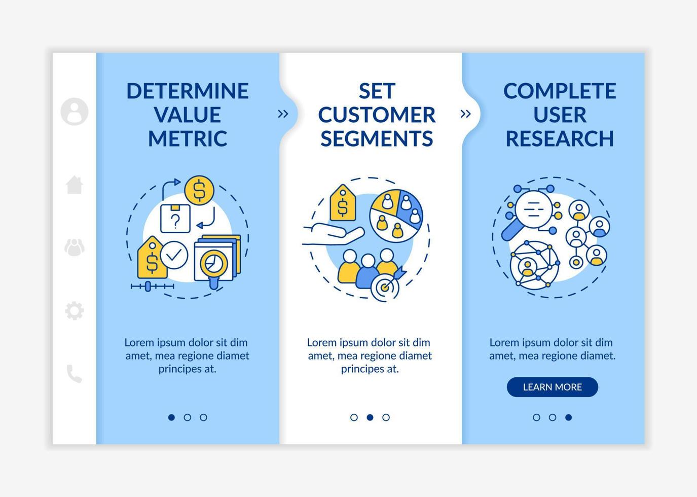 plantilla de incorporación azul y blanca de desarrollo de estrategia de precios. métrica de valor. sitio web móvil receptivo con iconos de concepto lineal. Tutorial de la página web Pantallas de 3 pasos. lato-negrita, fuentes regulares utilizadas Vector Pro