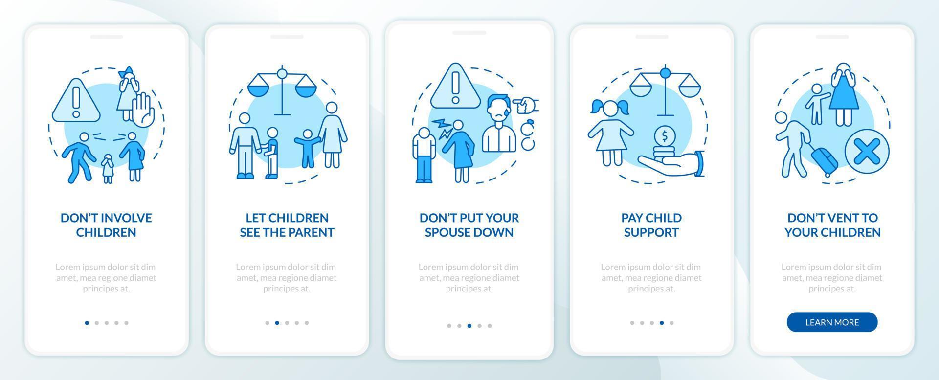 pantalla azul de la aplicación móvil de incorporación. tutorial de separación 5 pasos páginas de instrucciones gráficas con conceptos lineales. interfaz de usuario, ux, plantilla de interfaz gráfica de usuario. innumerables fuentes pro-negrita y regulares utilizadas Vector Pro