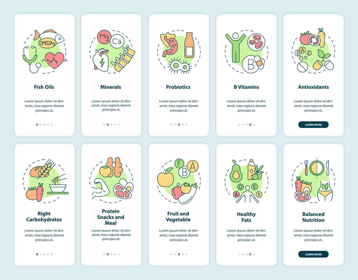 conjunto de pantalla de aplicación móvil de incorporación de suplementos y nutrición física. tutorial de vida 5 pasos páginas de instrucciones gráficas con conceptos lineales. interfaz de usuario, ux, plantilla de interfaz gráfica de usuario. innumerables fuentes pro-negrita y regulares utilizadas Vector Pro