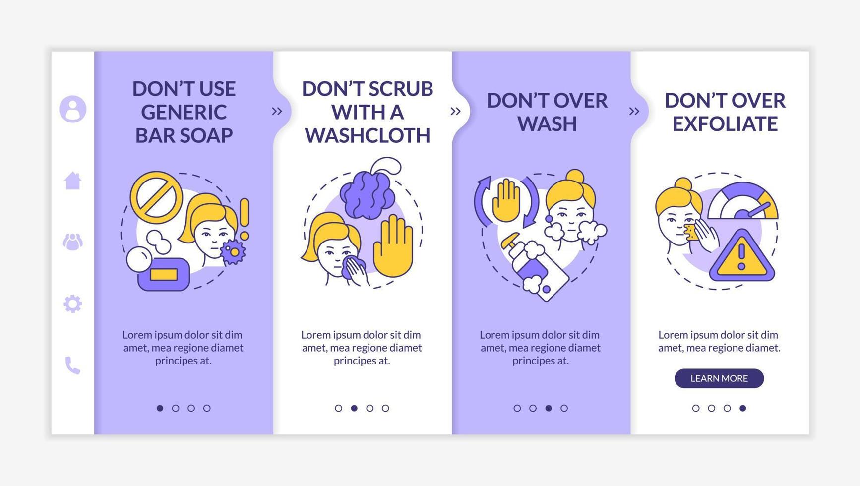 el cuidado de la piel no hace la plantilla de incorporación morada y blanca. procedimientos incorrectos. sitio web móvil receptivo con iconos de concepto lineal. Tutorial de página web Pantallas de 4 pasos. lato-negrita, fuentes regulares utilizadas Vector Pro